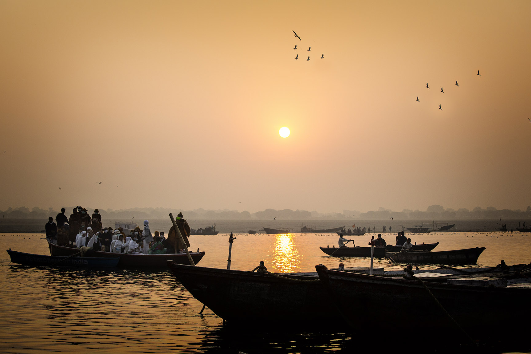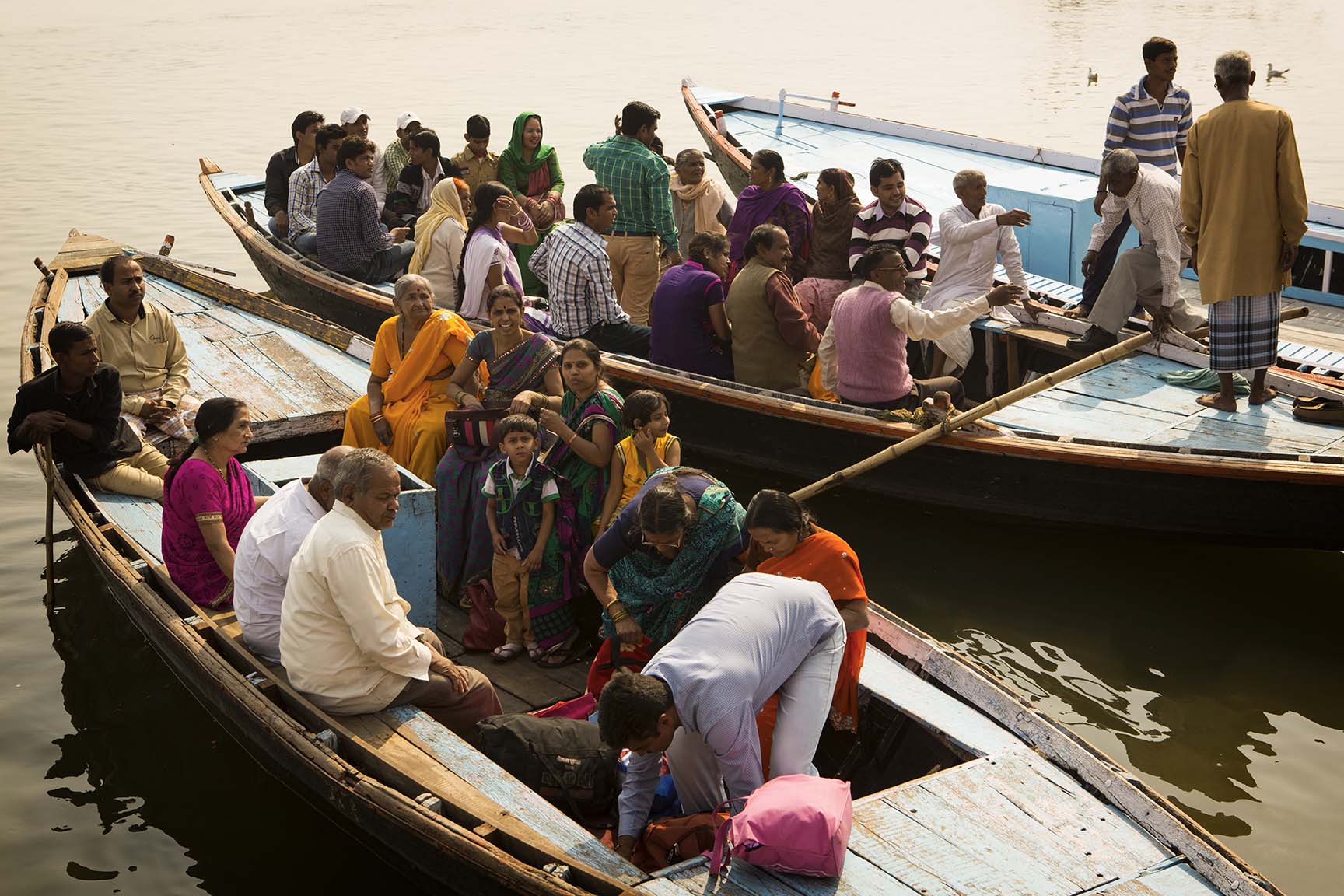 All’alba, in una atmosfera onirica i ghat cominciano lentamente ad animarsi. Centinaia di imbarcazioni trasportano pellegrini e abitanti da un ghat all’altro. Quando il sole comincia a irradiare il suo calore ogni cosa prende forma, il riflesso nel fiume delinea con chiarezza l’inizio di una nuova giornata.