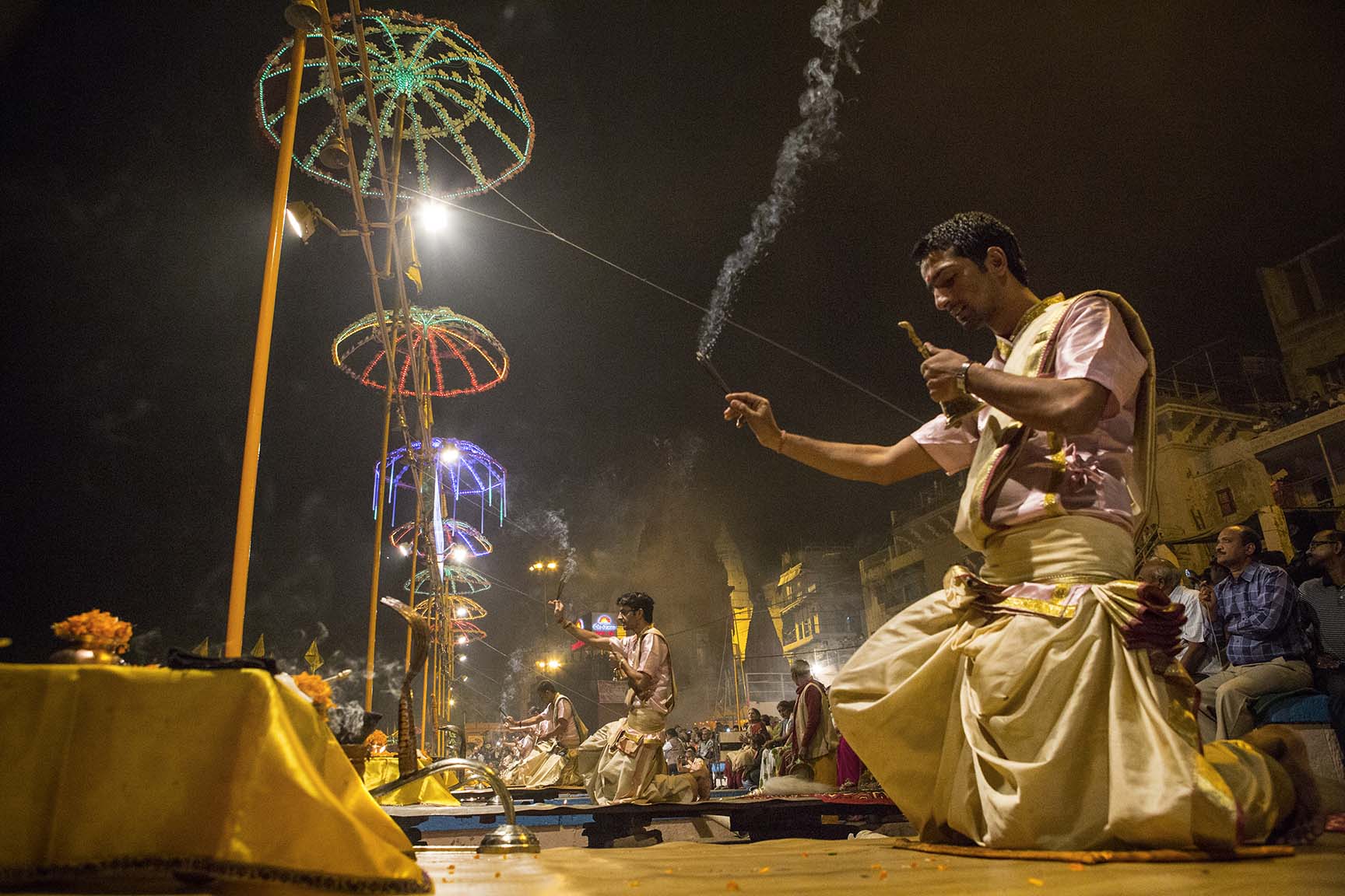 Quando il crepuscolo colora di rosa il cielo, viene lasciato spazio alla cerimonia del fuoco, il Ganga Aarti. La celebrazione si svolge sul ghat principale dove i bramini eseguono un’elaborata puja (rituale di offerta) che ha come componente essenziale il fuoco. Migliaia di persone scendono le vecchie e imponenti scalinate per assistere alla cerimonia.